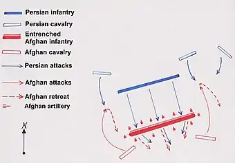 No effort was spared by Ashraf to try and relieve the pressure from his infantry in the centre and many charges were made by his cavalry against the Persian infantry's flank and rear but were all intercepted and thrown back by Nader's cavalry reserve.[5] Eventually the centre of the Afghan army dissolved under pressure and Ashraf having done his utmost to keep order amongst his unravelling army was forced to concede another crushing defeat, leading him to flee with the utmost urgency in order to reach Isfahan before Nader.
