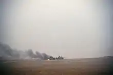 The Battle of Norfolk was a tank battle fought on February 27, 1991, during the Persian Gulf War, between armored forces of the United States and United Kingdom, and those of the Iraqi Republican Guard in the Muthanna Province of southern Iraq. The primary participants were the U.S. 2nd Armored Division (Forward), 1st Infantry Division (Mechanized), and the Iraqi 18th Mechanized and 9th Armoured Brigades of the Republican Guard Tawakalna Mechanized Infantry Division along with elements from eleven other Iraqi divisions.[25] The 2nd Armored Division(Fwd) was assigned to the American 1st Infantry Division as its 3rd maneuver brigade due to the fact that one of its brigades was not deployed.[26] The 2nd Armored Division(Fwd)'s Task Force 1-41 Infantry would be the spearhead of VII Corps.[20] The British 1st Armoured division was responsible for protecting the right flank of VII Corps, their main adversary being the Iraqi 52nd Armored Division and multiple infantry divisions. It was the final battle of the war before the unilateral ceasefire took effect.