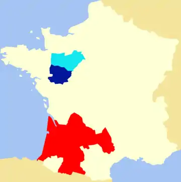 Guesclin maintained his close pursuit, and his constant ambushes and raids diminished the English numbers. They eventually reached the relative safe haven of the ford at Saint-Maur.[55] Calveley's force, which had taken no part in either of the battles,[57] had already crossed. A little beyond the ford was a strong English garrison at a fortified abbey, garrisoned by the English. Here, some of the English went east, while the majority continued towards Bordeaux. This group continued to be pursued by Guesclin, now joined again by Sancerre, deep into Poitou, where it was eventually run to ground outside Bressuire Castle. This was also occupied by an English garrison, but, fearing that if they opened the gates they would admit the French army alongside the English, they refused to do so.[55] As a result, what remained of this remnant of the Pontvallain army was wiped out under the walls.[56]