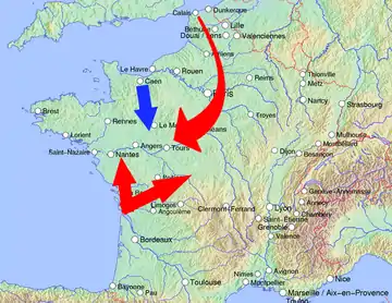 The few English survivors of the battles still at large scattered in confusion.[55] John Minsterworth's force, which had not been engaged at either battle, immediately removed itself to Brittany. Others made their way to Saint-Sauveur, south of the Loire. Calveley returned to Poitou. Around 300 of the English remnants joined together and overran Courcillon Castle, near Château-du-Loir, and then marched to the Loire, closely pursued by Sancerre.[55] Many of Knolles's men abandoned their positions garrisoning castles, including Rillé and Beaufort la Vallée, and also headed to the Loire.[55] This group, which included many wounded men and pillagers, joined up with the other English force,[56] making it "several hundred" in strength.[54]