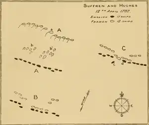 The Battle of Providien was the second in a series of naval battles fought between a British fleet, under Vice-Admiral Sir Edward Hughes, and a French fleet, under the Bailli de Suffren, off the coast of India during the Anglo-French War. The battle was fought on 12 April 1782 off the east coast of Ceylon, near a rocky islet called Providien, south of Trincomalee.[5]