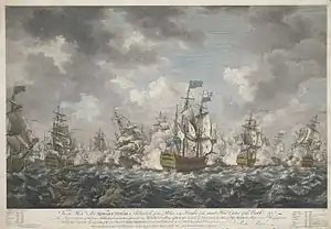 In August, the French Mediterranean Fleet under Jean-François de La Clue-Sabran attempted to break out past Gibraltar into the Atlantic. The British Mediterranean Fleet under Edward Boscawen caught them and a two-day battle resulted in three French ships of the line being captured, two destroyed, and five blockaded in neutral Cádiz; two escaped the battle to reach Rochefort.[18][19][20] The five French ships in Cadiz were blockaded by Boscawen's second-in-command, Thomas Brodrick.[19] Five of Boscawen's victorious ships were transferred to Admiral Edward Hawke's fleet, off Brest.[21]