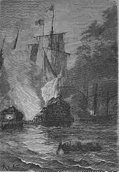 The Torbay, favoured by a breath of wind, crashed at the boom; it cracked, and the ship floated through in amongst the French squadron beyond. However, a sudden drop in the breeze prevented any other Allied vessel following, and Hopsonn found himself temporarily outnumbered. A fireship was laid alongside the Torbay, setting it alight. Fortunately for Hopsonn the fireship, laden with snuff from the Spanish Indies, suddenly blew up, and a great cloud enveloped the English vessel, partly extinguishing the flames thus enabling the crew to control the blaze.[18] According to Rooke's journal 53 men were drowned in the incident, but as the breeze picked up the other Allied ships managed to traverse the boom and engage with the enemy.