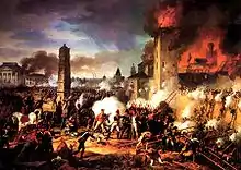 Lannes' men could not bring themselves to advance into the maelstrom a fourth time and so, exasperated, Lannes grabbed a scaling ladder and renewed his appeal. Then, amid an embarrassed silence, he angrily shouted: "I will let you see that I was a grenadier before I was a marshal and still am one." He took the ladder and moved forwards, but was physically restrained by his aides. His troops, shamed into action by the despair of their leader, rushed forward. The fourth assault party carried the walls and within minutes French troops were pouring into the now-doomed Ratisbon.[5]