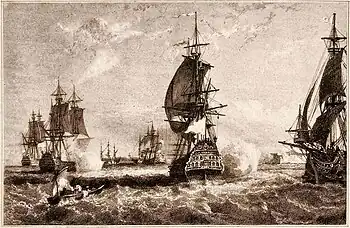 In spite of the British warning, the French appearance in Rio's harbour on 12 September was a surprise. The British news, when it arrived in August, had led Governor Francisco de Moraes de Castro to call out his militia and increase preparedness, and rumours of sails off Cabo Frio in early September had again raised the alert. However, on 11 September the governor ordered the militia to stand down, just as Duguay-Trouin was preparing his approach to the harbour.[5] The commander of Le Lys, Courserac, led the squadron directly in the Bay of Rio, between the forts lining the harbour entry, and straight at seven Portuguese warships that were anchored there. The Portuguese fleet commander, admiral Gaspar da Costa, could do nothing but cut the cables in hopes of getting his ships moving. Three of battleships grounded and were destroyed by the Portuguese to prevent their capture; the fourth was taken by the French and burned. Fire from the forts, undermanned after the order to stand down, did some damage to the French fleet, inflicting 300 casualties before the ships passed out of range.[3]