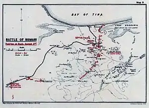 The 52nd (Lowland) Division developed a strong defensive position at Romani which had its left flank on the Mediterranean Sea, here a series of redoubts were built running southwards from Mahamdiyah along the line of high sand hills about 7 miles (11 km) to a dune known as Katib Gannit 100 feet (30 m) high. This line of sand hills, which were high enough to see Katia oasis from, marked the eastern edge of an area of very soft and shifting sand beyond which were lower dunes and harder sand where movement by both infantry and mounted forces was considerably easier. Between the shore at the western end of the Bardawil Lagoon and Katib Gannit (the principal tactical point on the eastern slopes of the Romani heights), the infantry constructed a line of 12 redoubts about 750 yards (690 m) apart, with a second series of redoubts covering the Romani railway station and the right of the defensive position which curved like a hook westward, then northward. A total of 18 redoubts were constructed, which when fully garrisoned held from 40 to 170 rifles each, with Lewis guns and an average of two Vickers machine guns allotted to each position; they were well wired on the right side of each of the positions, although there was no wire between the redoubts.[46] This defensive line was supported by artillery.[47][48]