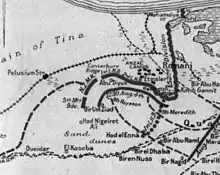 Map of the Egyptian Sinai Peninsula (Bi'r ar Rummanah is Romani and Al Qantjarah is Kantara).