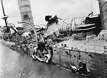 The British made several attempts to sink Königsberg including one to slip a shallow-draught torpedo boat (with escorts) within range, an operation easily repulsed by the force in the delta. A blockship, the Newbridge, was sunk by the British across one of the delta mouths to prevent her escape; however, it was soon realized that Königsberg could still escape through one of the delta's other channels. Dummy mines were laid in some of these alternatives, but they were considered a doubtful deterrent.[1] A civilian pilot named Cutler was hired to bring his Curtiss seaplane for reconnaissance; his plane was shot down, although the presence of the elusive cruiser was verified.[2] A pair of Royal Naval Air Service Sopwith seaplanes were brought up with the intention of scouting and even bombing the ship, but they soon fell apart in the tropical conditions. A trio of Short seaplanes[3] fared a little better, managing to take photographs of the ship before they were grounded by the glue-melting tropical heat and German fire.[4]