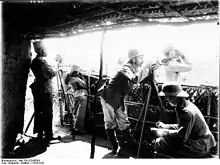 Two shallow-draught monitors, HMS Mersey and Severn, were towed to the Rufiji from Malta by the Red Sea, reaching the delta in June 1915. With non-essential items removed, added armour bolted on, and covered by a full bombardment from the rest of the fleet, they ran the gauntlet. Aided by a squadron of four land aircraft, two Caudrons and two Henry Farmans,[7] based at Mafia Island to spot the fall of shells, they engaged in a long-range duel with Königsberg, which was assisted by shore-based spotters. Although Mersey was hit and the monitors were unable to score on the first day, they returned again on 11 July. Finally, their 6 in (150 mm) guns knocked out Königsberg's armament and then reduced her to a wreck. At around 14:00, Looff ordered her scuttled with a torpedo.[8] After the battle, the British were unquestionably the strongest naval power in the Indian Ocean.