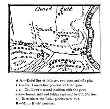 The battle occurred when Union regiments advanced toward the Confederate camp. Lieutenant Colonel George S. Patton, the grandfather of the famous George S. Patton of World War II, commanded the Confederate line behind Harlem Creek, 2 miles from the main Confederate camp. The Union forces engaged the Confederates, launching artillery barrages and musket volleys. The 21st Ohio charged the Confederates with bayonets but were repulsed with casualties. The Union forces began falling back after suffering casualties from the charge.