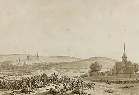 On 9 October, the first clash occurred between the troops of Bernadotte and Tauentzien near the Oschitz Wood, a belt of timber which lies south of Schleiz. Bernadotte ordered General of Brigade François Werlé to clear the forest to the right as Drouet's division advanced on Schleiz. In the thick woods, the infantry moved ahead while Watier's regiment followed behind. Werlé's advance guard took possession of the woods but was prevented from continuing on by a Prussian force under General-Major Rudolf Ernst Christoph von Bila. Petre calls this general Bila II and his older brother Bila I.[22] This gives the names and dates of the two Bila brothers.[23]