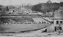 After a major defeat in which he lost 7,500 men and 40 cannons, MacMahon aborted the planned link-up with Bazaine and ordered the Army of Châlons to withdraw north-west towards the obsolete 17th-century fortress of Sedan.[5] His intention was to rest the army, which had been involved in a long series of marches, resupply it with ammunition and, in his words, maneuver in front of the enemy.[6] MacMahon underestimated the German strength and believed the hills surrounding Sedan would offer a major defensive advantage.[7] The French rear was protected by the fortress of Sedan, and offered a defensive position at the Calvaire d'Illy, which had both hills and woods to provide cover for any defense.[7] MacMahon denied a request from General Félix Douay, commander of 7th Corps, to dig trenches, claiming the army would not remain at Sedan for long.[7]