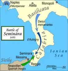 The Battle of Seminara, part of the First Italian War, was fought in Calabria on 28 June 1495 between a French garrison in recently conquered Southern Italy and the allied forces of Spain and Naples which were attempting to reconquer these territories. Against the redoubtable combination of gendarmes and Swiss mercenary pikemen in the French force, the allies had only Neapolitan troops of indifferent quality and a small corps of lightly-armed Spanish soldiers, accustomed to fighting the Moors of Spain. The result was a rout, and much of the fighting centered on delaying actions to permit the fleeing allied force to escape.