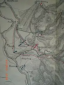 The Battle of Siegburg was the first engagement of the French offensive across the River Rhine - that offensive was to become the main campaign of 1796 during the War of the First Coalition. On 30 May 1796 général de division Jean-Baptiste Kléber crossed the river at Düsseldorf with the two divisions commanded by général de division Lefebvre and général de division Colaud. He then moved on Siegburg, where he won the battle on 1 June, thus enabling general Jean-Baptiste Jourdan to bring the bulk of his force across the Rhine at Neuwied.