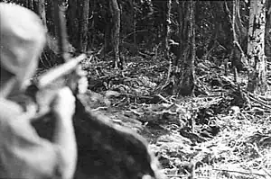 The Japanese launched a number of attacks on the Australians between 15 and 17 March.[26] Under fire from three sides and in danger of being enveloped, on 19 March the Australians launched an attack of their own along the Buin Road, and although they had some success in clearing the forward Japanese positions, they then encountered a system of pillboxes and trenches around the Hatai Road junction.[28] The 25th Infantry Battalion's commander, McKinna, ordered the two platoons led by Lieutenant Dick Jefferies to attack the pillboxes, supported by a section of machine guns, and several PIAT anti-tank weapons. A two-hour fire-fight and a bayonet charge followed.[29] This attack was ultimately beaten back by the defenders with the loss of eight Australians killed and 14 wounded.[27][30] A second attack was launched on 22 March. Supported by heavy artillery, mortars and machine guns, it proved successful, largely after the individual efforts of Corporal Reg Rattey, who single-handedly silenced several bunkers.[31][27]