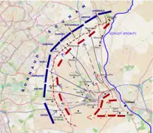 In the Battle of Tourcoing on 17–18 May, the Coalition army under Coburg concentrated 74,000 soldiers in a major effort to crush the 82,000-strong French forces led temporarily by Souham. The result was a French victory due to a serious breakdown in Allied cooperation and staff work.[12] Coburg and his chief-of-staff Karl Mack von Leiberich planned to catch the French at Courtrai and Menin between five converging columns from the south and Clerfayt's column from the north.[13] Souham and his lieutenants Moreau, Étienne Macdonald, and Jean Reynier devised a counterstroke whereby the divisions of Souham and Bonnaud attacked the two most advanced Coalition columns while Moreau held off Clerfayt.[14] On 18 May, the French crushed the two exposed columns of York and Rudolf Ritter von Otto while the other three southern columns remained strangely inert.[15]