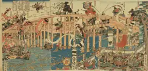 Minamoto no Yorimasa and Prince Mochihito, along with a force of about fifteen hundred men including the warrior monks of Mii-dera and the Watanabe clan, fled south towards Nara.[2] They crossed the Uji River, just outside the Byōdō-in, and tore up the planks of the bridge behind them to prevent the Taira from following.[3]