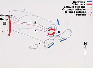 ![]() 1 Allahvardi Khan charges his cavalry at the Ottoman army and assails their flanks aggressively 2 The Ottomans attack and Allahvardi feigns retreat, encouraging the Ottoman general to join the pursuit with a large part of his army 3 Abbas signals his hidden army to march over the hill and fall upon the Ottomans pursuing Allahvardi's forces which turn round and catch the Ottomans in a pincer 4 Another contingent of the hidden Safavid troops marches against the now weakened Ottoman line defending their camp and easily overcomes them 5 Subsequently a portion of the aforementioned group return to seal off the Ottomans in a pocket, killing and imprisoning almost all locked into the trap | |||||||||