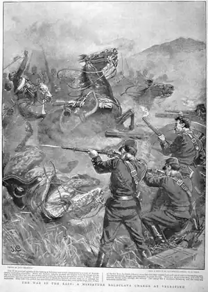 Consequently, at 13:00 the Ottoman cavalry began to move into position to attack: a first echelon of two companies under Colonel Mahmud Muhtar were tasked with penetrating the Greek positions at the western slopes of Panagia height; Ibrahim Bey led a second echelon of three companies to the left and rear of the first, to assist it in its breakthrough; and a third echelon of two companies followed to the right and rear as a reserve force.[13] While Mahmud Muhtar's first echelon successfully reached the slopes of Panagia and turned south as planned, the second echelon missed the turn and continued advancing to the east. When Ibrahim Bey realized this, it was too late: if he tried to turn south, his men would suffer heavy casualties to the entrenched Greeks on its flank. Thus he ordered his bugler to signal the retreat north. The third echelon followed suit, returning to the positions it had started from.[13] This left Mahmud Muhtar's first echelon, already charging against the Greek trenches west of Panagia, alone and without any support. The Ottoman attack reached the Greek trenches, with some of the cavalrymen fighting with their sabres or dismounting to shoot at the defending Greeks; in the end, the Ottomans were forced to retreat by the heavy fire of the well-entrenched infantry.[13]