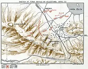 The Battle of Velestino (Greek: Μάχη του Βελεστίνου, Turkish: Velestin Muharebesi) comprised two separate combats, which took place on 27 April [O.S. 15 April] 1897–30 April [O.S. 18 April] 1897 and 5 May [O.S. 23 April] 1897–6 May [O.S. 24 April] 1897, between the Greek and Ottoman armies at Velestino in Thessaly, as part of the Greco-Turkish War of 1897.