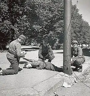Finnish medics give first aid to a soldier wounded in the battle
