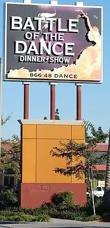 Battle of the Dance was a dinner theater in Anaheim, California, featuring contrasting styles of dance—principally flamenco and Irish folk dancing—performed by a cast of over 40 dancers. Designed to cash in on the popularity of such shows as Dancing with the Stars and So You Think You Can Dance, the venture was very ambitious: the brainchild of Medieval Times founder Andrés Gelabert, backed by $10 million in investor capital, and performing in a dedicated 40,000 square foot venue.[1] Performances debuted to much fanfare in February 2011, and the show met with critical success: for example, the Orange County Register said, "Without a doubt... some of the best flamenco and Spanish dancers you'll ever see," and called the choreography "masterful".[2] However, the show never became a popular success, and it closed indefinitely just 16 months after its opening, in June 2012.[3]