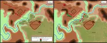 The campsite was to be laid out on a hill which gently sloped down to the river. On the other side of the river there was another hill directly opposite, similarly sloping. The top of that hill was densely wooded but the lower part was open and sloped down to the river over a distance of 200 paces (roughly 300 metres (330 yd)). The enemy was concealed inside the woods, but a few cavalry pickets could be seen in the open area by the river. The river was very wide, but only about three feet (one metre) deep.[13]