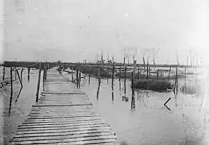 On 25 October, the German pressure on the Belgians was so great that a decision was taken to inundate the Belgian front line. After an abortive attempt on 21 October, the Belgians managed to open the sluices at Nieuwpoort during the nights of 26–30 October, during high tides, steadily raising the water level until an impassable flooded area was created of about one mi (2 km) wide, stretching as far south as Diksmuide.[27][lower-alpha 1]