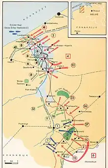 The Germans attacked again on the Yser front on 30 October, overran the Belgian second line and reached Ramskapelle and Pervijze.[28] Belgian and French counter-attacks recovered Ramskapelle and the final attack, planned for the next day was called off when the Germans realised that the land behind them was flooding. The Germans withdrew in the night of 30/31 October.[29] On 10 November, Diksmuide fell and the fighting continued further south until 22 November, in the First Battle of Ypres.[30]