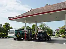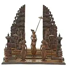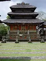 The most notable landmark is the village temple, known as Pura Puseh, an ancient structure dated to the 11th century, embellished with intricate stone carvings.[17] It is located in the northern part of the village, 200 metres (660 ft) off the main road.[22] The temple also has an inscription that testifies to the date of founding of Batuan in 1022 AD.[23] The temple underwent restoration in 1992. It is a five-tiered gateway tower, clearly influenced by Indian religious architecture. Its icons and decorations, however, are typically Balinese in style. Notable depictions include a Bhoma head overlooking the main gateway, the god Wisnu astride a bull, great elephants on the central stairway balustrade, and Siwa standing amongst skulls.[22] The roof of the temple is made of the fibre of chromatic black palm tree. The maintenance of the temple is done by the residents of the village. The temple is situated on the main road from Denpasar to Ubud.[23]