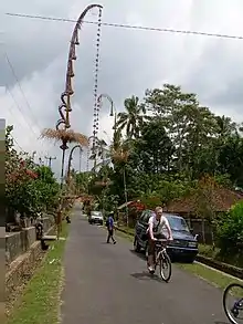 The most popular festival that is observed in Batuan and other places in Bali is the Galungan (meaning "When the Dharma is winning), which is a national festival that occurs over a cycle of every 210 days. It is the religious belief that Gods descend to the earth on this day. During this festival a long bamboo pole called locally as penjor is made to decorate the entrance to the family compound. The festival is observed starting with the day of arrival of gods and ends on the 10th day known as Kuningan. During this temple celebrations are held every 210 days. It is known as the Odlan festival and is held in the village when child artists also give music performances. During this festival, dancing, music and elaborate decorations and food offerings are a common feature.[21]