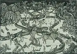 Batuan village gave its name to a style of painting which evolved in the 1930s after a group of local villagers, Ida Bagus Made Togog and Ida Bagus Made Wija began experimenting with ink-washed paintings on black backgrounds. These are popular to this day.[12] The black and white background was said to evoke the supernatural.[8] Artists in Batuan later changed to gouache and acrylics. In the early years of the Batuan genre art, Batuan artists explored subjects that concerned themselves rather than creating tourist art. While anthropologists Margaret Mead and Gregory Bateson had a special relationship with Batuan artists, they avoided influencing them and were careful in what Western pictures they were to show to the Batuans. Batuan artists depicted only a traditional world in their pictures, avoiding objects such as automobiles, until at least the late 1980s.[13] Anthropologists also interpret that the paintings made by artists of Batuan are visual texts which represent the “Balinese Character”.[14]