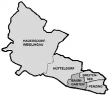 Baumgarten (Central Bavarian: Baamgoatn) is an area of Vienna's fourteenth district. Until 1891, it was a little village outside the city. Together with the villages Hütteldorf, Penzing, Breitensee and Hadersdorf-Weidlingau it became Vienna's 14th district. Baumgarten was first mentioned in 1200, but probably existed already in earlier times. It was originally subdivided in Ober- and Unterbaumgarten (the upper part and the lower part). In 1850, the two parts were merged into one community. Until the 19th century, it had a very rural character with farms and vineyards and it was a popular summer holiday retreat for the citizens of Vienna. Some of the richer summer guests had built nice summer residences in this area. One of them was known as the "Baumgarten Castle", which was demolished in 1890 and a school was built instead. Right opposite it is the "Baumgarten Casino" that still hosts music and dance events.
