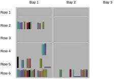 Rows consist of a number of bays, either single-sided or double-sided, connected to each other. The standard length of a row is five to six bays, but it is not uncommon to find rows seven bays wide or even wider. In some countries, a row is referred to as a 'stack' or a 'range'.