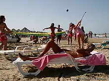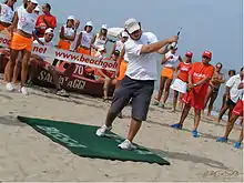 Beach golf was created in Pescara, Italy in 1999 by Mauro De Marco.[1] It was designed to be played on crowded beaches during the summer. Objects on the beach are incorporated into the game. Beach umbrellas, bathing people and other objects are turned into obstacles of the game. The rules allow the audience to interact with participants.