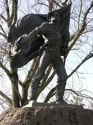 The sculpture depicts a man holding a flag on top of a rock, which serves as base for the bronze sculpture.[2] The rock weighs approximately 40 tons.[3] The man holds a flagpole in his proper left hand. In his proper right hand he holds a hat. He stands up straight and is wearing a neckerchief and a long sleeve shirt that is rolled up to his elbows. Four bronze plaques are located on the rock base, two on the front and one on the back. The lower right front plaque serves as the artist signature and is inscribed with: McQuarrie. The lower left plaque states who the foundry was: L. DE ROME FOUNDERS. The main plaque shows a grizzly bear standing on all fours on top of a shield with flags of the United States and California. The flags are crossed over each other.[2] On the front of the base is inscribed: