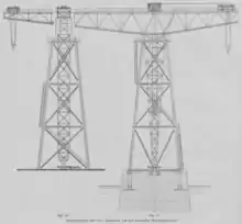 The Beardmore Crane had two opposite cantilevered jibs, both equipped with moving winches, for a total length of 233 feet (71 m).[1] From the jib to the ground extended a tapering lattice, which was enclosed by a lattice tower. The jib was slewed by a mechanism on the ground, and bearings at the top of the tower and where the extension met the ground allowed it to turn.[1][2] The winch on each arm was powered by two 52 horsepower (39 kW) electric motors for hoisting and two 14 horsepower (10 kW) motors for slewing, and a 18 horsepower (13 kW) motor for slewing.[1] The tower took eight minutes to make a full revolution.[1]
