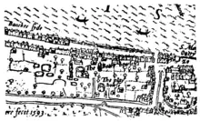 The date of the Beargarden's construction is unknown; it was in existence by the 1560s, when it is shown on the "woodcut" map of the city. Questions of the Beargarden's location and date are complicated by the fact that animal sports were conducted at more than one place in Southwark in this era; the Agas map shows both a bull-baiting and a bear-baiting ring, situated near each other (bulls to the west, bears to the east).[5] John Taylor the Water Poet, testifying in the Court of Exchequer in 1620 or 1621, said that "the game of bear-baiting hath been kept in four several [i.e. separate] places, at Mason Stairs on the Bankside, near Maid Lane by the corner of Pike Garden, at the beargarden which was parcel of the possession of William Payne, and at the place where they now are kept."[6]