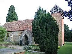The parish church of St. Mary The Virgin has been largely rebuilt in modern times, but the nave dates probably from the end of the 12th century and the chancel with its thinner walls may be of the 13th or 14th century. Much of the upper part of the walling is modern, also all the windows. The nave was lengthened about 10 ft (3.0 m). and the western porch and bell-turret was added early in the 19th century. The plan is a plain rectangle about 55½ ft. long inside, of which about 20½ ft. is the chancel, by 15½ ft. The chancel walls are 2 ft 3 in (0.69 m) thick, built of blue lias rubble, mostly squared in the lower parts and with sandstone angle-dressings. It is probable the north wall has been partly rebuilt. The east window is a single light set high up, by John Hardman in 1886, but there is patching for a former lower window.