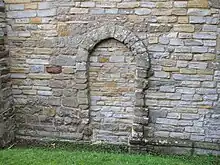 The north and south windows are of two lights and were also formerly lower in the walls. About a yard east of them are short straight joints and pieces of sandstone that may indicate former windows. The nave has side walls 2 ft 9 in (0.84 m) thick; the lower halves of them are of early shaly rubble with wide jointing, and above this are medieval sandstone courses. The north and south windows are of two lights and both have patchings below them for lower windows. In the north wall are the remains of a 12th-century doorway of sandstone, now blocked: it has jambs of two orders, the inner with an edge-roll; the outer is square and had nook-shafts, which have disappeared except for the western capital; this is of cushion form with chevron ornament.