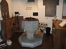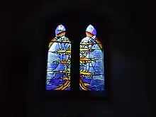 The head is pointed and of one square order, probably a later alteration. In the south wall is another blocked doorway with square pilaster-jambs and pointed head, perhaps of the 13th century but difficult to date. The two buttresses to each wall are medieval. The west wall and porch-tower are of red brick. The bell-cote is of wood. The main roof is tiled.[2] One of the three bells is medieval.[10] There is now a single bell by Wm Blews inscribed MARIA, fleur de Lys, Queen, King, fleur de lys MARIA that was made by re-casting two bells when the building was re-modelled in 1875.[11] The Millennium Window by Art of Glass, Earlswood (River of the Water of Life) 2001 donated by Audrey Payne in memory of her late husband.