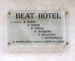 In July 2009, as part of a major William Burroughs symposium NakedLunch@50, a special tribute was held outside 9 Rue Gît-le-Coeur, with Jean-Jacques Lebel unveiling a plaque commemorative, now permanently hammered to the outside wall next to the main entrance, honoring the Beat Hotel's seven most famous occupants: B. Gysin, H. Norse, G. Corso, A. Ginsberg, P. Orlovsky, I. Sommerville, W. Burroughs.