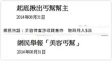 - 1 2 3 "網民舉報「美容丐幫」" [Internet users reported beauty beggars]. Hong Kong Daily News. 31 August 2014. Archived from the original on 2 April 2015. Retrieved 18 March 2015.