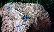 The Becraft Formation is a coarse limestone with occasional thin interbedded shale layers. Individual limestone beds within the formation range from 5 to 15 centimeters in thickness, while the shale horizons are up to 3 centimeters thick. Chert nodules are found near the top of the formation.[5] The limestone which constitutes the bulk of the formation is pinkish grey in color and contains abundant invertebrate fossils including brachiopods and crinoids.[6] The Becraft is a grainstone in Dunham classification.[7] Recently the Helderberg Group, of which the Becraft Formation is a member, has been investigated as a possible geologic seal for subsurface carbon dioxide sequestration efforts.[8]