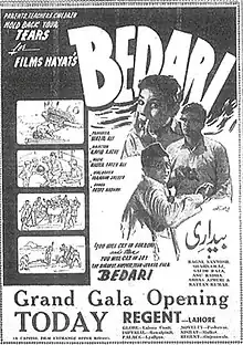 Bedari is a Pakistani Urdu black and white film which was released in 1956. The lead cast of the film includes Ratan Kumar, Santosh Kumar, Ragni, Meena Shorey, Bibbo and Lehri. The film was premiered at Regent cinema, Lahore.[1] It was the first film of Kumar in Pakistan, after he moved from India with his family. Bedari was commercially successful primarily due to its songs.[2]