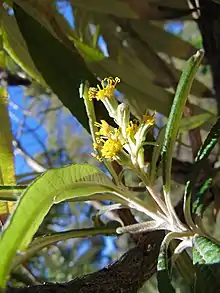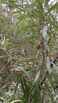 Bedfordia salicina is a common large shrub or small tree, 2–5 m (6 ft 7 in – 16 ft 5 in) tall and 2–3 m (6 ft 7 in – 9 ft 10 in) wide, in the family Asteraceae.[2] The central stem twists and bends in a mostly erect habit, with many lateral stems branching outwards and upward in a candelabra-like-fashion. Young wood of apical meristems are covered in silvery tomentum. Soft mesophyllic leaves have a dark green adaxial surface and a silvery abaxial covered in dense, matted, single layer of stellate hairs.[2][3][4] Leaves are alternate and arise from very short petioles (up to 8 mm (0.31 in)), are long (60–150 mm (2.4–5.9 in)) and moderately broad (10–18 mm (0.39–0.71 in)), oblanceolate and undulate with prominent midrib and subtending veins and slightly revolute margins.[2][5] Inflorescence an irregular panicle of 8-25 capitula which arise from the several upper leaf axils to form dense clusters of more than five bright yellow tubular disc florets and herbaceous phyllaries.[2][5] Flowers October through to December.[5] Fruits form an achene 3 mm (0.12 in) long through to March; old capitula remains year-round.[5]