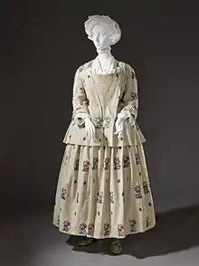 A bedgown (sometimes bed gown, bedjacket or shortgown) is an article of women's clothing for the upper body, usually thigh-length and wrapping or tying in front. Bedgowns of lightweight printed cotton fabric were fashionable at-home morning wear in the 18th century. Over time, bedgowns (also called in this context shortgowns) became the staple upper garment of British and American female working-class street wear from the 18th to early 19th centuries, worn over petticoats and often topped with an apron. Made of sturdy cotton, linen, wool or linsey-woolsey, these bedgowns were simply cut to a T-shaped pattern, and were worn overlapped in front or with the front skirts cutaway.[1] The term "bed gown" to describe this item of clothing was used as late as 1876.[2]