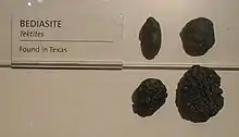 Bediasites are part of the 34-million-year-old North American strewnfield coming from the Chesapeake Bay impact crater.[4] Two strewnfields and tektite groups are associated with this impact: the black Bediasites in Texas and the green Georgiaites in Georgia.[5]