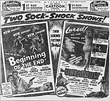 Beginning of the End premiered in Chicago on June 16, 1957.[34][42] Stars Peter Graves and Peggie Castle were both on hand for the premiere.[42][43] The film opened widely in 244 theaters in the South and Midwest on June 20.[6][44][45] It played as part of a double feature with The Unearthly (a film based loosely on 1932's Island of Lost Souls and 1956's The Black Sleep), another AB-PT production.[6][7][14][43][46] As planned, it was distributed by Republic Pictures.[46]