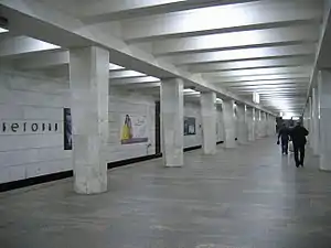 Begovaya (Russian: Бегова́я) is a station on the Tagansko-Krasnopresnenskaya Line of the Moscow Metro. Named after the nearby Central Moscow Hippodrome, the station was opened on 30 December 1972, as part of the Krasnopresnensky radius. Originally the architect V. Cheremin intended to use the typical column tri-span "Novaya Sorokonozhka", but produced a design of pillars starting as a square at the top and octagonally transforming into a square that is at 45 degrees to the top layout. The floor was covered in dark coloured granite and the walls with ceramic tiles, with metallic artworks on the theme of equestrian sports. The station was the first to have repair work done on its walls when the ceramic tiles were replaced by white marble. The vestibules feature a combined escalator/staircase and the top portal is decorated with artwork called "The Mighty Horsemen", all of which along with the wall artworks were created by the artist E. Ladygin. The vestibules are situated next to a junction between 1905 street, the Third Ring Road (originally called Begovaya, hence the name), the Khoroshovo Highway and Rozanova Street. In the tunnel between the Ulitsa 1905 Goda and Begovaya stations there is an access branch that leads into the Krasnaya Presnya depot, which used to serve the Krasnopresnenskaya Line from 1972 until 1975 when the Planernoye depot opened.